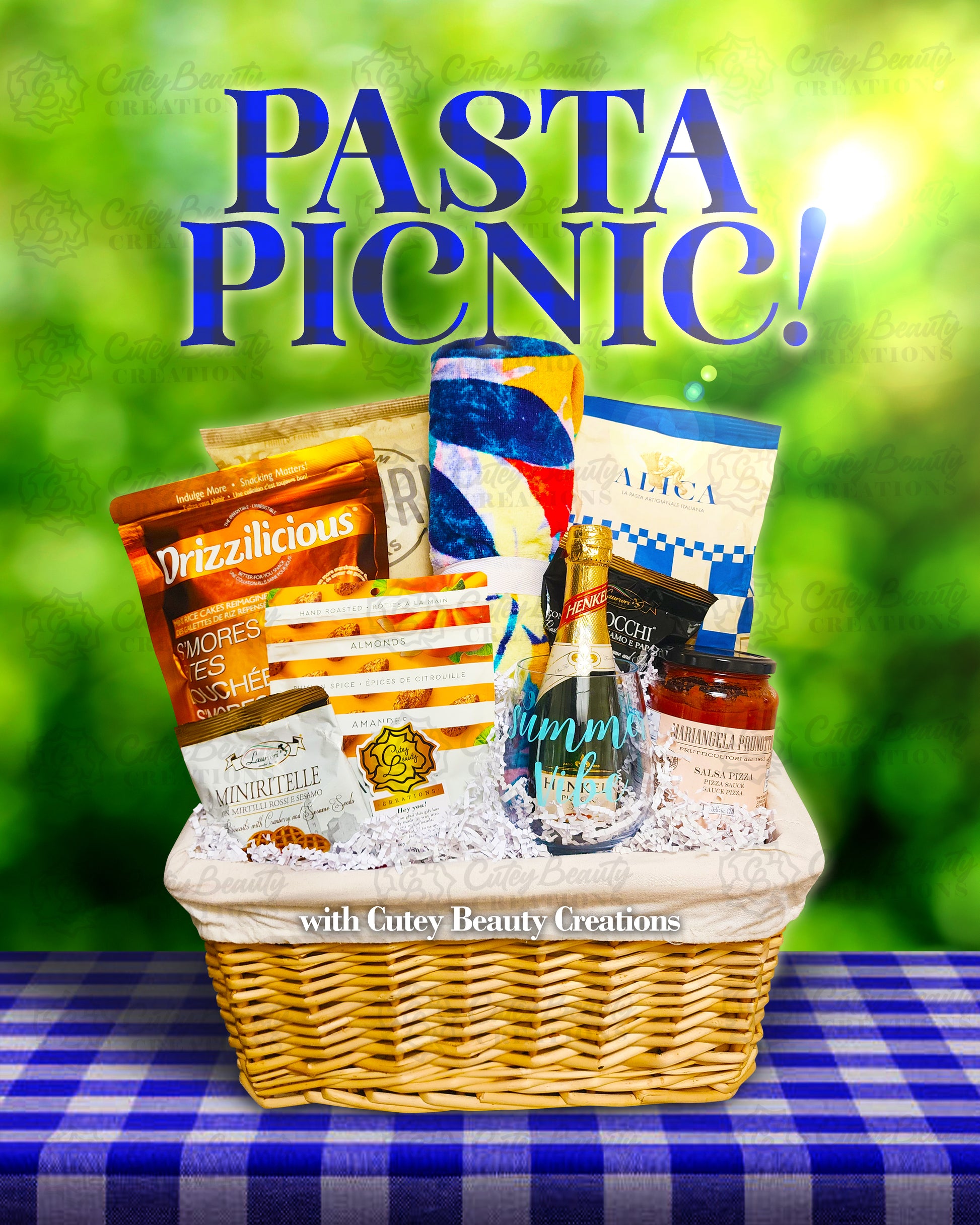 Soak up the sunshine with a saucy twist! Bundled in a rustic wicker basket, Cutey Beauty Creations brings fun flavours to the fields, and the promise of an unforgettable meal with this premium uncooked crafted pasta, ready to transform into a tender, satisfying bite, while the paired sauce bursts with savoury rich sun-ripened tomatoes and aromatic herbs. From package to plate, it’s the start of something delicious. We've also included snackable treats for the sweet tooth, a soft patterned towel to relax on, mixed nuts and crackers, and a beverage for celebrating the beautiful day—because every day deserves to be celebrated and enjoyed outdoors! 🌞🍃